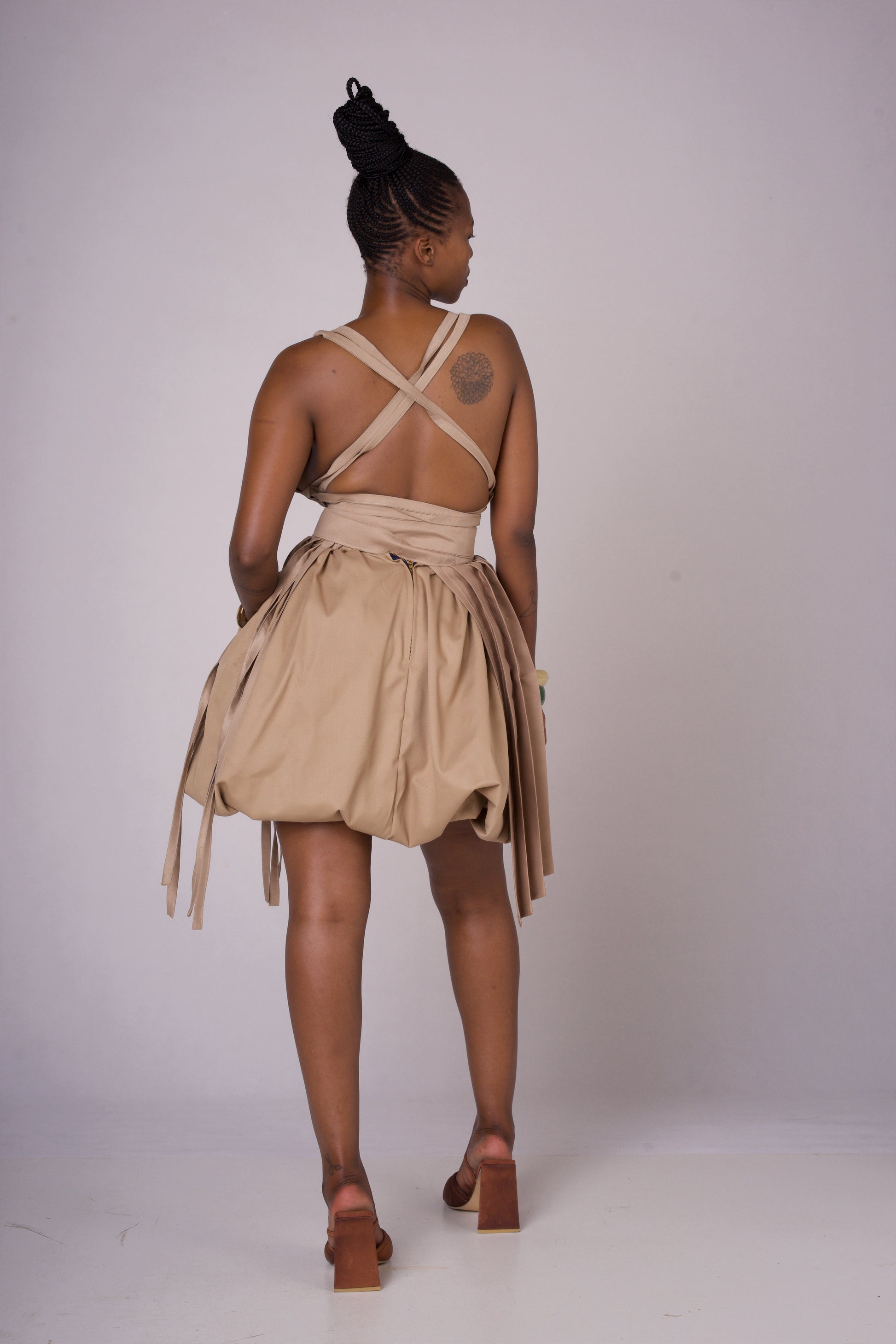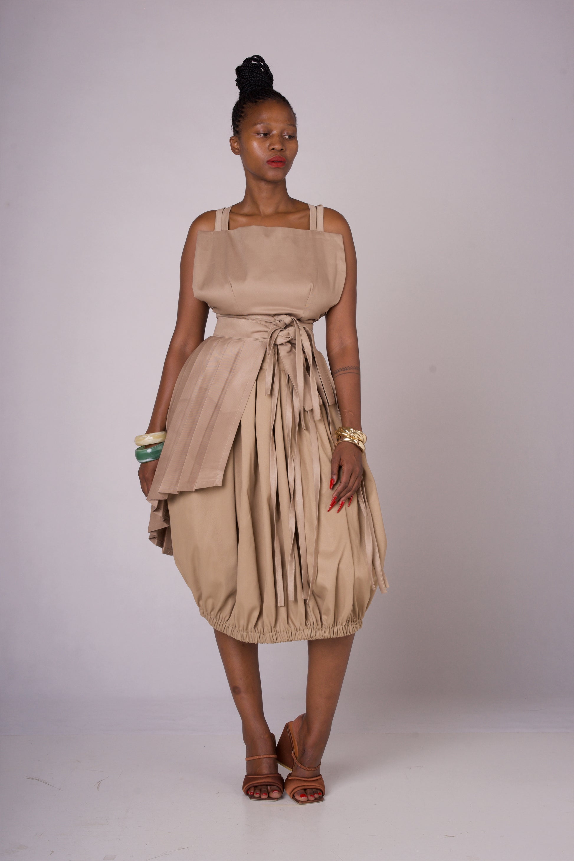 a baige (KHAKHI) bible skirt with elastic at the bottom. and a phinifa top