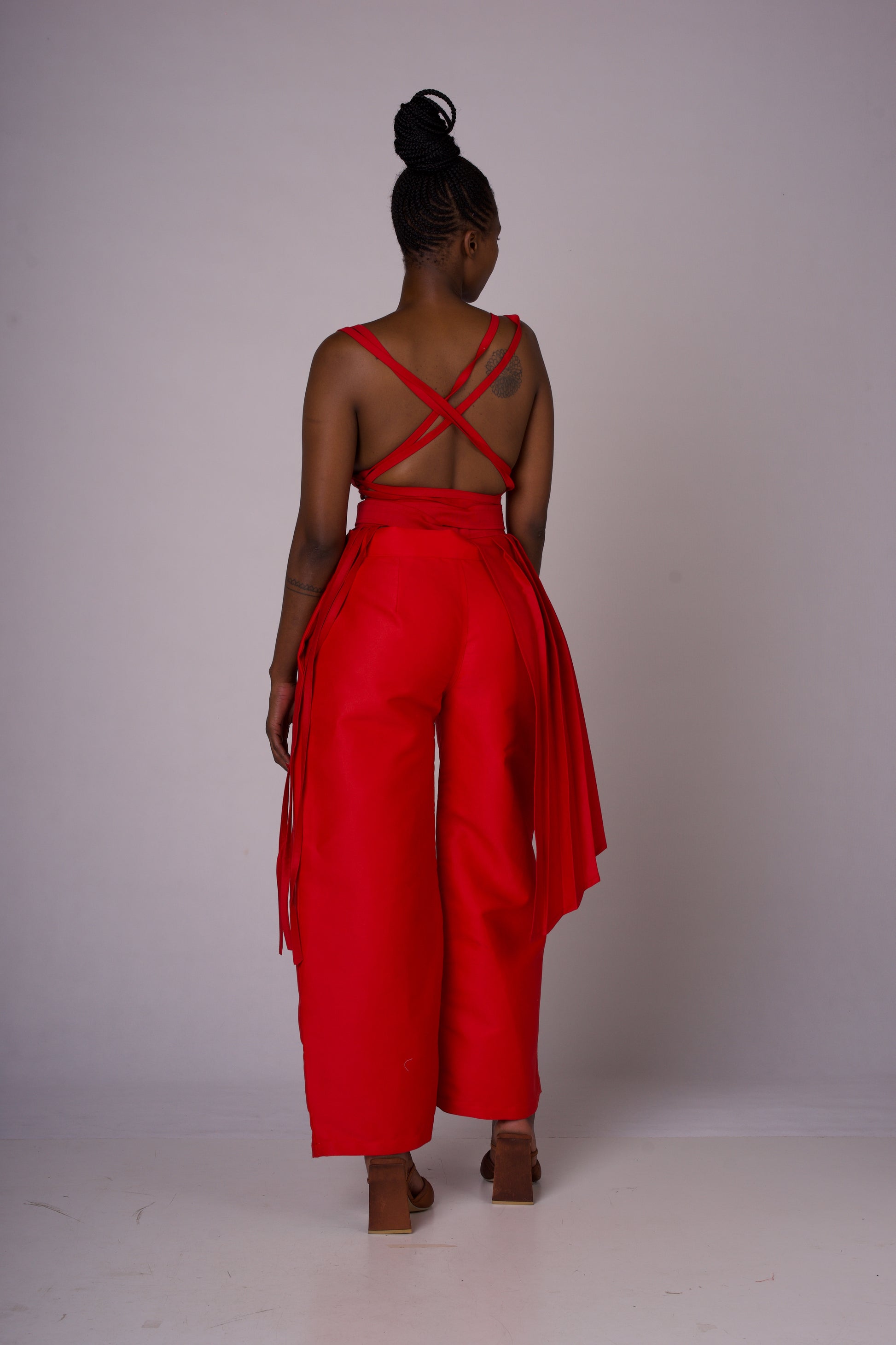 Red Pinafa, red high waist pants two piece combo